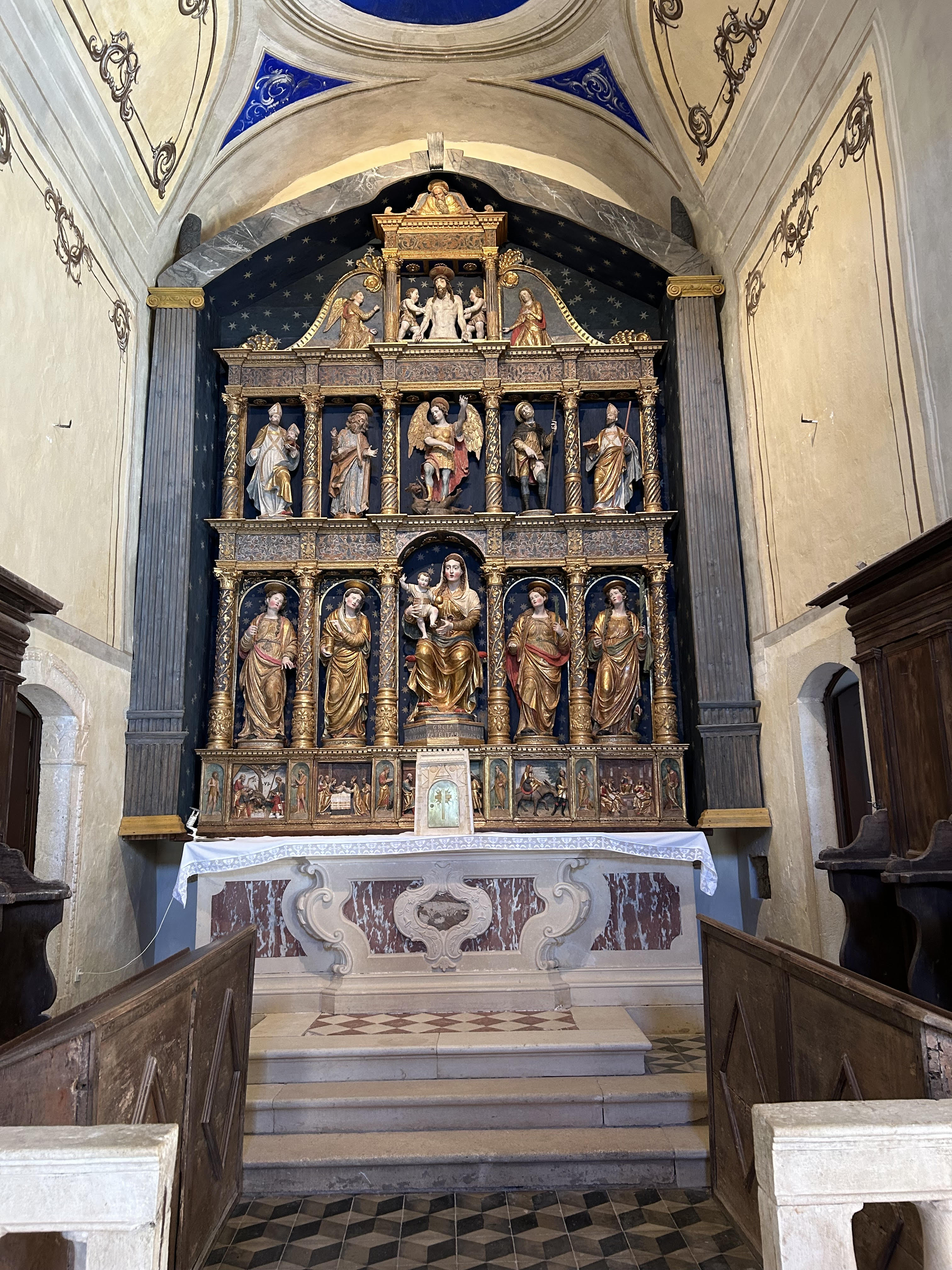 Pretpostavlja se da je mutvoranski oltar naručio pulski biskup Altobello Averoldi, zaslužan za obnovu crkve sv. Marije Magdalene dvadesetih godina 16. stoljeća, a iz signature saznajemo da je oltar dovršen 1533. godine. Vrsno rezbareni, bogato pozlaćeni i pažljivo oslikani oltar izrađen je u duhu talijanske visoke renesanse. Ta se estetika iščitava u „matronskim proporcijama” figura, nježnom kontrapostu te finim, laganim draperijama koje decentno prate dinamiku svetačkih likova. U bogatom ikonografskom programu, kiparskom se vrsnoćom izdvajaju skulpture svetica, tumači Ivan Matejčić, koje s dojmljivo klasicizirajućim stavom i draperijom predstavljaju „prave renesansne kipove all`antica”. Naknadnim višestrukim repolikromiranjem poništen je izvorni izgled oltara preoblikovanog u skladu s ukusom kasnijih epoha. Jedino je ostalo nepreslikano središnje polje predele, zaklonjeno kamenim baroknim svetohraništem, čija su izvorna pozlata i polikromija dale naslutiti raskošan izgled mutvoranskog oltara iz radionice Paola Campsa.