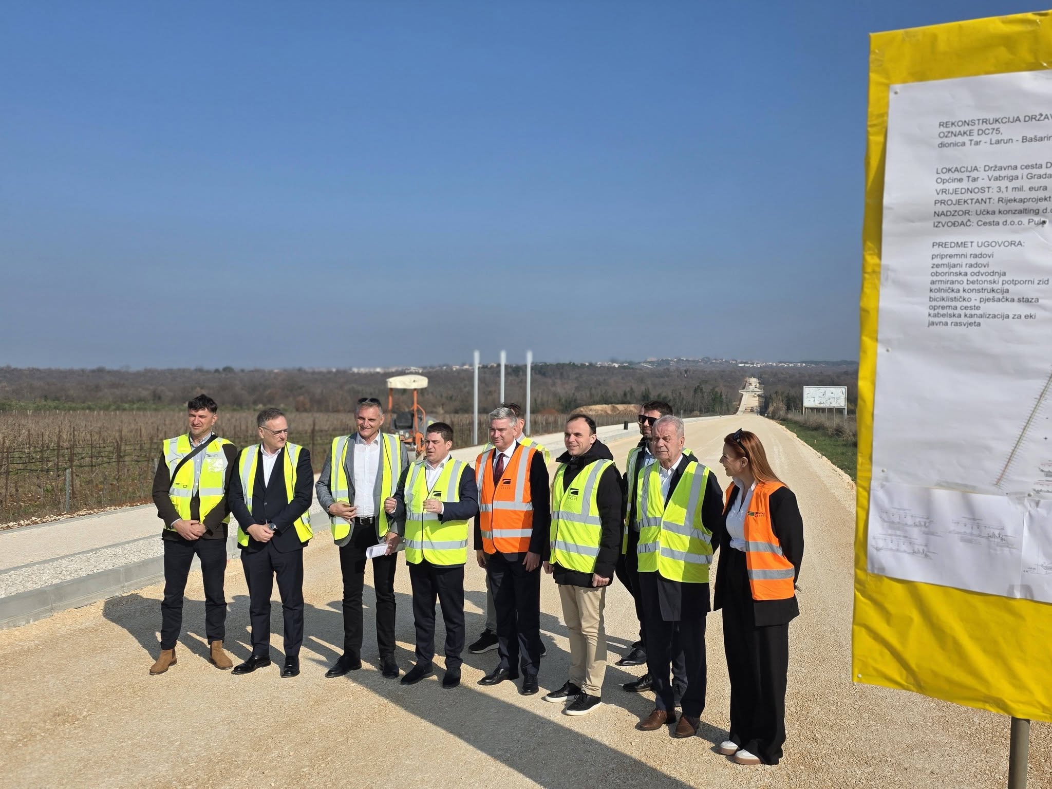 Nakon obilaska radova u Puli, potpredsjednik Vlade i ministar Oleg Butković u pratnji saborskog zastupnika Antona Klimana, župana Borisa Miletića, gradonačelnika Poreča Lorisa Peršurića i predsjednika uprave Hrvatskih cesta Ivice Budimira, obišao je radove na rekonstrukciji državne ceste DC75 Tar - Larun - Bašarinka kod Poreča.