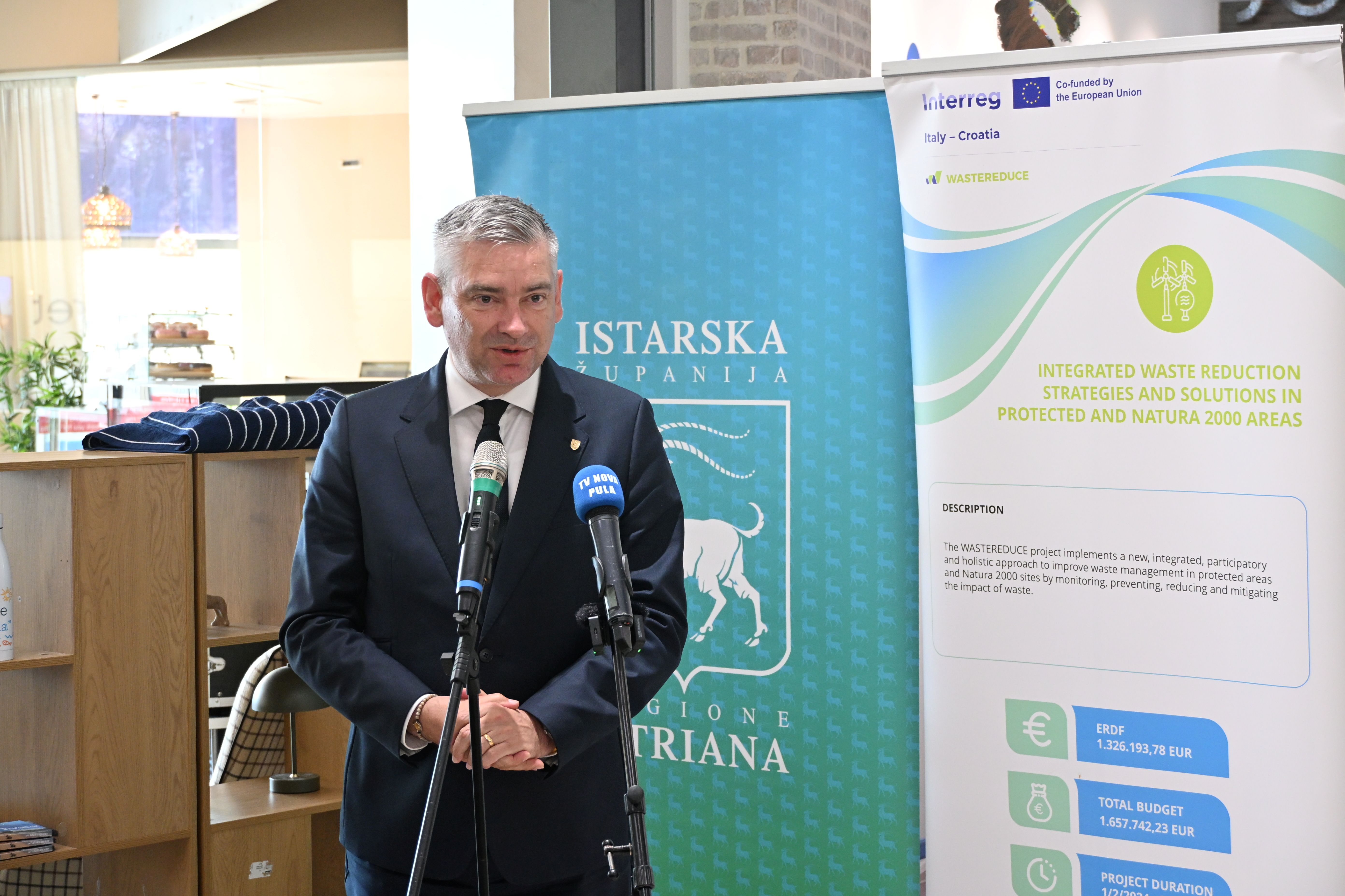 Projekt WASTEREDUCE provodi se u razdoblju od 1. veljače 2024. do 31. srpnja 2026. godine, s ciljem unaprjeđenja upravljanja otpadom u zaštićenim i Natura 2000 područjima kroz inovativna rješenja i jačanje suradnje među partnerima. Ukupna vrijednost projekta iznosi 1.657.742 eura, od čega Istarskoj županiji pripada 208.380 eura, uz sufinanciranje iz Europskog fonda za regionalni razvoj u okviru programa Interreg Italija – Hrvatska.