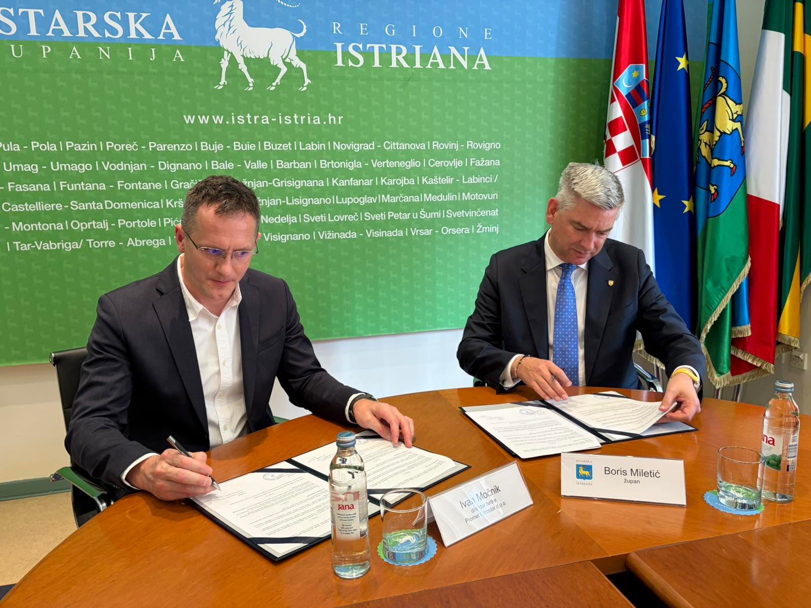 U sjedištu Istarske županije u Puli, župan Boris Miletić potpisao je jučer Ugovor o uspostavi i implementaciji webGIS sustava (geoinformacijski sustav temeljen na web tehnologijama) evidencije poduzetničkih zona s trgovačkim društvom Promet i prostor d.o.o., kojeg zastupa direktor Ivan Močnik. Na potpisivanju je bila prisutna i resorna pročelnica Upravnog odjela za gospodarstvo, dr. sc. Cinzia Zubin. WebGIS sustav objedinit će i vizualizirati sve ključne podatke o poduzetničkim zonama Istarske županije, s ciljem povećanja transparentnosti i dodatnog poticanja investicija.